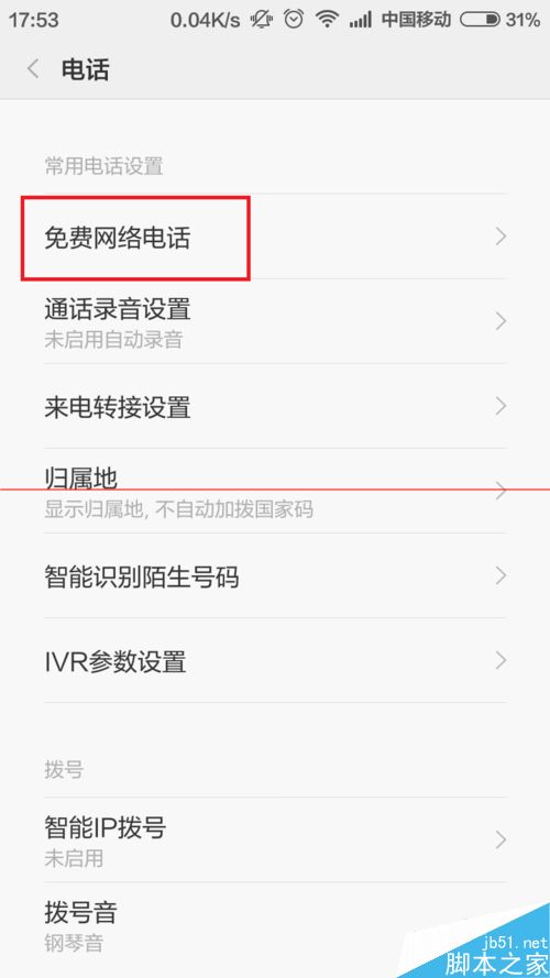 3、进入电话应用设置以后,我们会在设置菜单中第一项看到的就是“免费网络电话”设置项目,点击即可进入该设置项目。