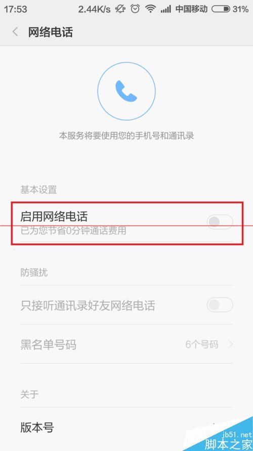 4、进入免费网络电话设置项目以后,我们会看到免费网络电话还没有处于开启状态,需要我们点击该功能按钮才能开启该功能。