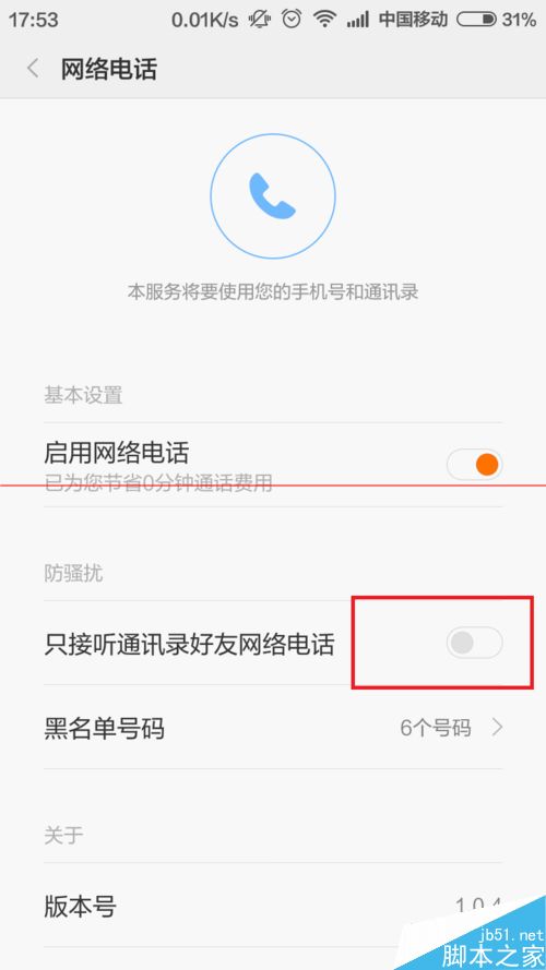 5、当我们开启了免费网络电话功能按钮以后,还有一些设置项目,如果你不想通讯录以外的朋友们给你拨打网络电话,将“只接听通讯录好友免费网络电话”按钮开启就可以只接听来自通讯录好友的电话啦。