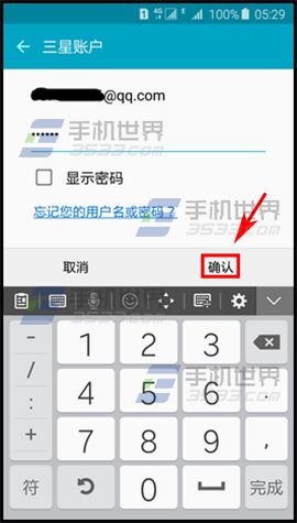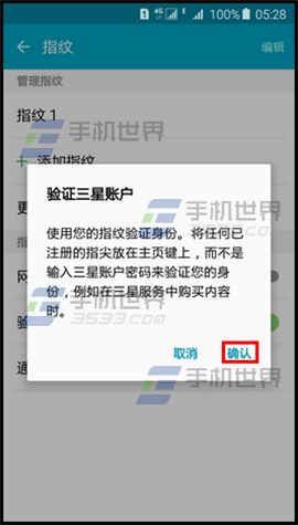 4)输入三星账户和密码,点击【确认】,完成后你在三星应用商店购买时,就直接可以用指纹输入。(如下图)