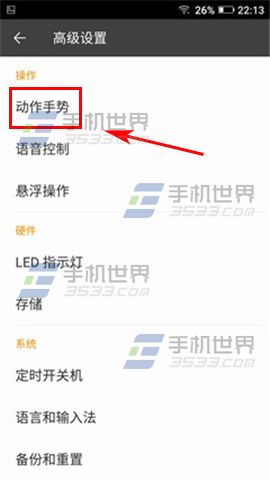 打开设置,找到并点击高级设置,进入界面后点击【动作手势】,将【体感手势】开启后,勾选【智能亮屏】即可。(如下图)
