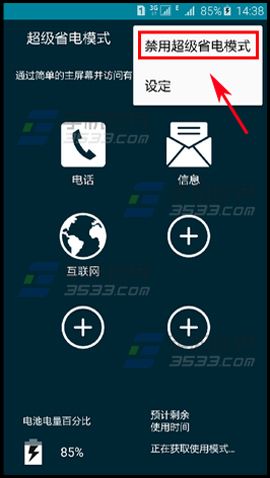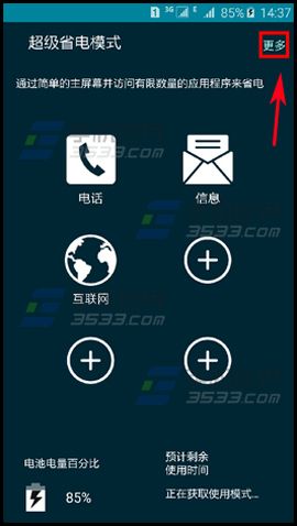 在超级省电模式的界面点击右上角的【更多】,点击【禁用超级省电模式】即可退出省电模式。(如下图)