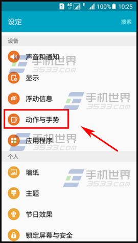1)点击打开三星S6的【设置】,在设备一栏点击【动作与手势】。(如下图)