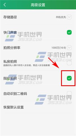 2)在高级设置界面勾选【指纹拍照】,进入相机界面轻按手机的指纹识别器就可以实现拍摄功能。另外在手机屏幕关闭的情况下轻按手机的指纹识别器就可以马上启动相机并进行拍照。(如下图)