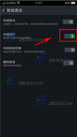 2)进入智能通话后开启【体感接听】右边开关即可。(如下图)