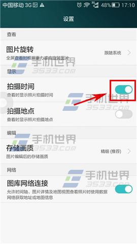 打开荣耀4【相册】,点击【菜单】选择【设置】,将【拍摄时间】开启即可。(如下图)