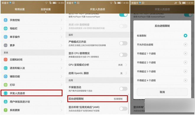 进入开发人员选项,拉到最后,设置后台程序限制,可以进一步限制程序的后台运行,实现省电效果。