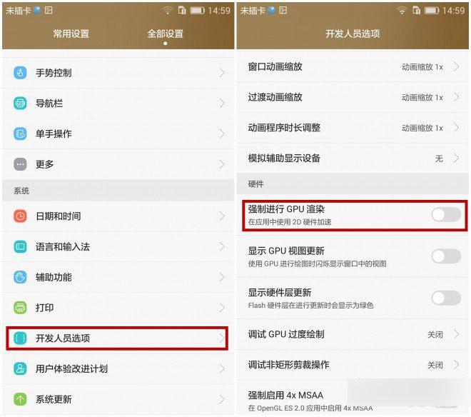 在入开发人员选项开启“强制进行GPU渲染”虽然可以让游戏、视频等更加流畅,但是会严重增加手机的功耗,因此也要谨慎选择。