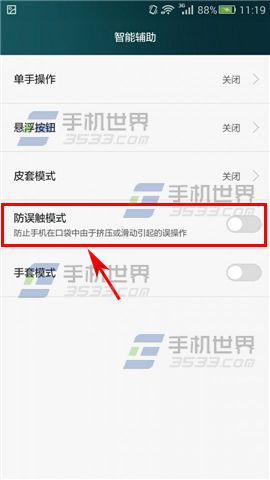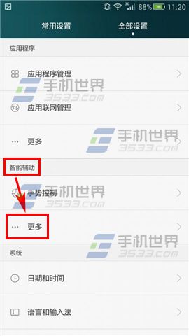 打开华为P8青春版的【设置】,在【全部设置】栏的【智能辅助】分类下点击【更多】,然后关闭【防误触模式】选项开关就可以了。(如下图)