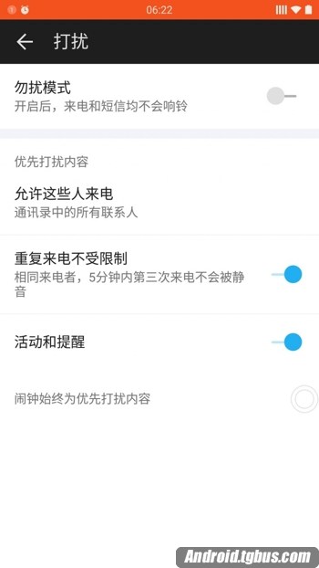 3、“重复来电不受限制”,开启之后,相同来电者,5分钟内第三次来电不会被静音。