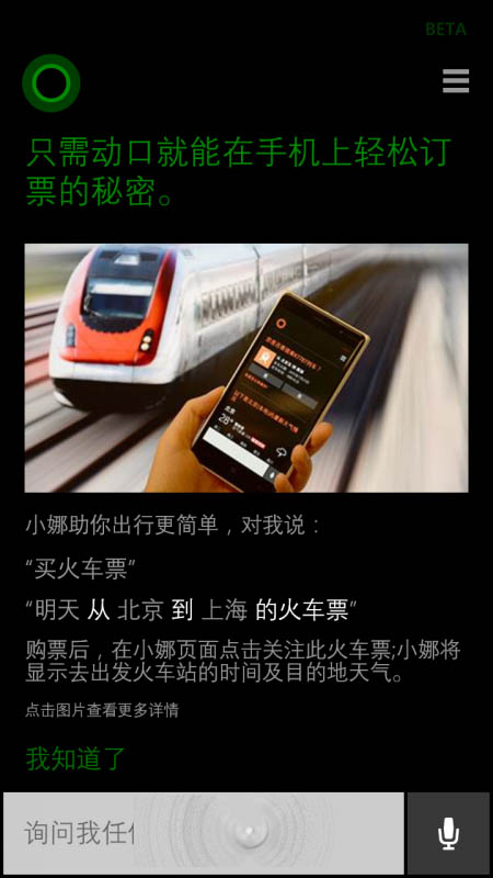 7月24日消息,WP8.1平台微软小娜为用户们解锁了一项新技能,“只需动口就能在手机上轻松订票的秘密”,现在只需喊一声“买火车票”,即可召唤小娜MM帮忙查询、购买火车票。