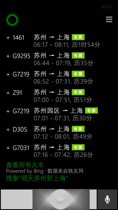 例如我们口述“7月25日苏州到上海”,小娜将及时查询当日的所有车次,包括K、T、D、G字的车票票价以及时刻表,选择其中即自动跳转到购买界面。