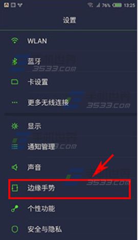1)进入努比亚my布拉格的设置界面,点击【边缘手势】,进入界面选择【边缘滑动】。(如下图)