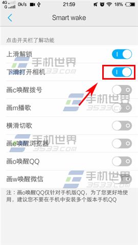 2)点击【Smare wake】一栏进入,开启【下滑打开相机】右边按钮即可。(如下图)