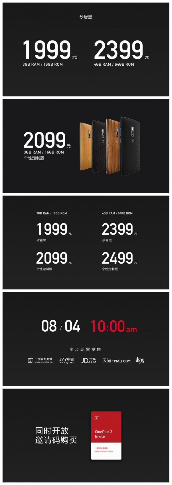 一加手机2共有5款后盖材质(砂岩黑、 竹质、 黑杏、 酸枝、凯芙拉)。价格方面,国内3GB LPDDR4、16GB ROM售1999元;4GB LPDDR4、64GB ROM版售2399元。
