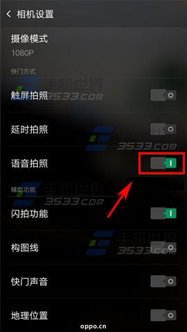 1)进入OPPO R7Plus的相机界面,点击右下角五圆进入,点击【齿轮】进入相机设置,开启【语音拍照】按钮即可。(如下图)(注:在拍照时,对着手机说“拍照”、“茄子”等字眼即可免去点按拍照键,直接拍照!)