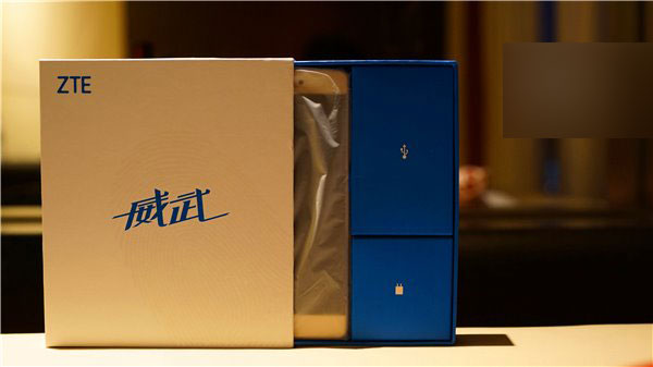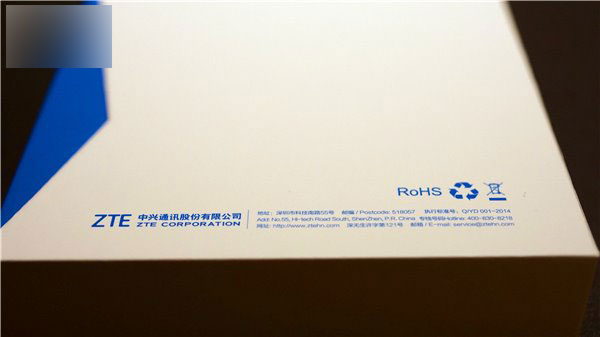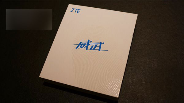 ▼手机的包装盒采用了蓝白设计,延续了之前中兴威武系列的简洁设计风格,在正面威武两字下,我们还能看出指纹的标识,盒子的后面是关于中兴威武3的常规信息。