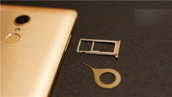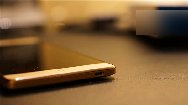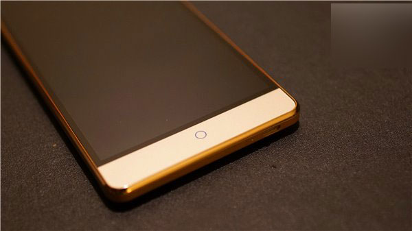 ▼这次我们拿到的是金色版,且由于采用了金属机身,并没有千元机价位的廉价感,机身正面设计比较简洁,上部听筒也比较平整,下面采用了一个蓝色小圆点设计,小圆点左右为菜单和返回触摸区域,保持了简约的设计风格。