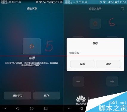 3、跟着操作,手机便会进入到按键学习的界面,这时点击“确定”。此刻你只要把手机对着你所要学习的任何可以释放红外线的遥控器,手机等,然后长按你要学习的按键,便可进行学习。学习完成后,点击对应按键,若是,被遥控的设备进行对应动作,则点击保存即可。