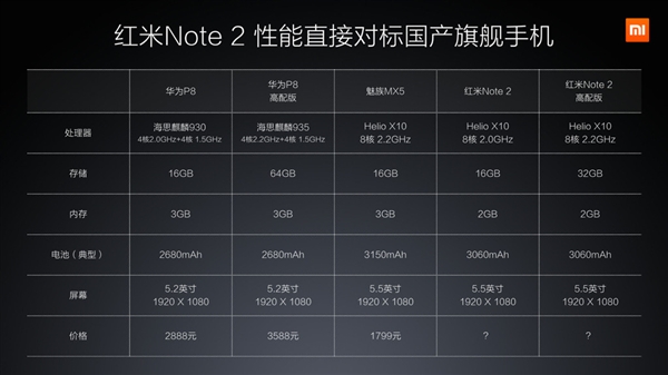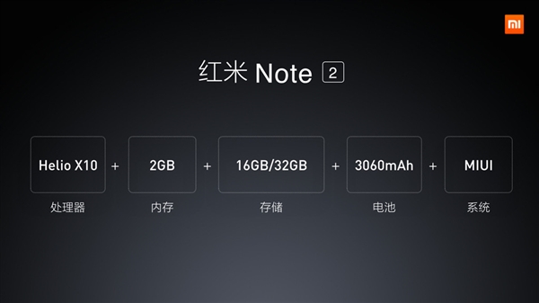 红米Note 2配备有2GB的内存,16GB/32GB的存储空间可供选择,电池容量也高达3060mAh(支持拆卸),适配刚刚发布的MIUI 7。相机规格为前置500万+后置1300万组合。