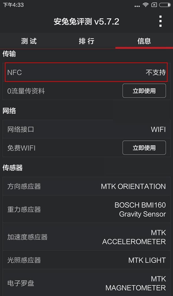 另外,我们也通过安兔兔测试发现,红米Note 2对于检测到NFC功能结果显示【不支持】,如上图所示。