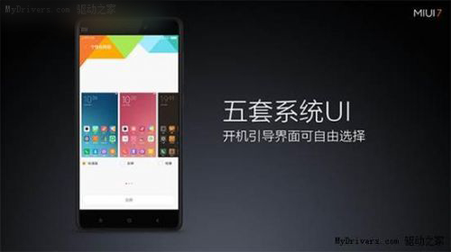 MIUI 7发布了四套官方个性化系统UI,分别为女神版、女生版、男生版和轻奢版,每套系统UI配合色彩体系重新设计桌面图标,并将个性化设计元素运用于每个系统操作界面。加上标准版系统UI,MIUI 7预置提供了五套系统UI,用户在开机时就可选择。