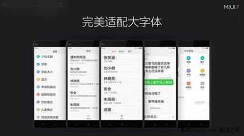 为了帮助视力欠佳的用户获得更优异的个性交互体验,MIUI 7对系统字体做了全局优化,新增“超大号”和“巨无霸”两大大字体。MIUI 7目前支持标准、中号、大号、超大号、巨无霸五种全局字体。
