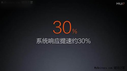 MIUI 7全面优化系统响应速度。MIUI 7缩短了系统响应时间,在App启动过程中将加载数据与窗口动画合为同步进行。不仅如此,MIUI 7还基于场景优化了CPU调度机制,在需要系统快速响应时让CPU极速运行,在其他时间则使用经济功耗。经过全面优化,MIUI 7系统响应提速约30%,让很多日常使用变得更得心应手、无往不利。