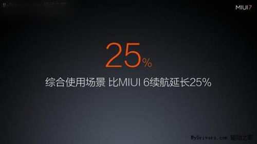 此外,MIUI 7还对最热门的500款App量身优化,限制应用后台不必要地使用WiFi、数据网络或位置服务;并且缩短数据网络连接链路时长,降低无数据传输时手机与基站的连接功耗,通过全面优化后台省电,MIUI 7的系统续航延长25%以上。