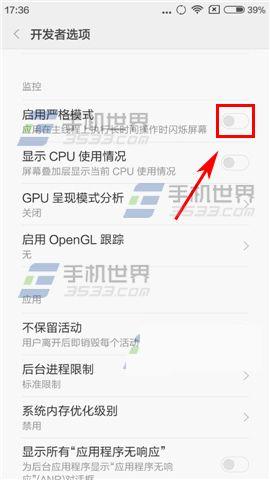 2)点击【开发者选项】,找到并关闭【启用严格模式】开关即可。(注:开发者选项开启方法请参考本文中的相关教程)(如下图)