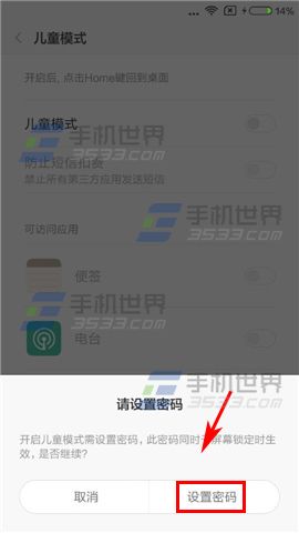 2)开启【儿童模式】的开关,点击【设置密码】进行密码设置。(如下图)