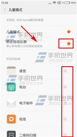 3)选择一个【解锁方式】,打开【防止短信扣费】开关,在儿童模式下你可以选择性开启【可访问应用】。(如下图)