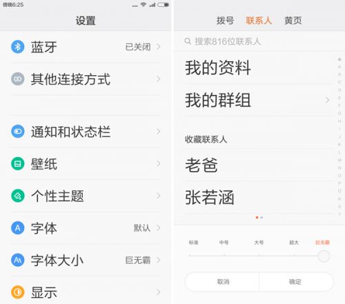 MIUI7优化了五套系统字体,新增的超大号、巨无霸两套大字体适合视力不佳人群,特别是视力不太好的老人,这项功能颇为实用。