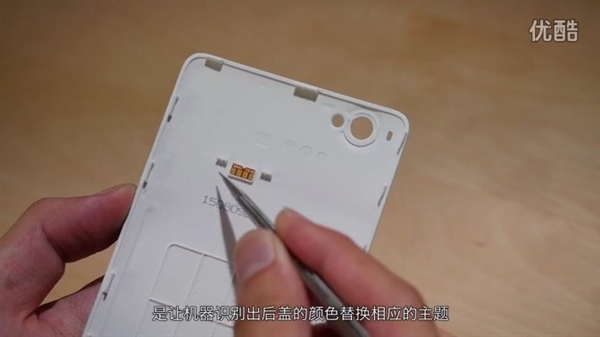 - 可以从底部直接扣开后盖,很薄、比较硬的的塑料材质,没有弹性。后盖上的小芯片用来识别后盖颜色,自动切换对应主题。