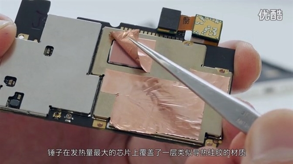 - 发热量大的芯片上覆盖了一层导热胶,结合铜箔、石墨散热片、镁铝合金共同散热,比魅蓝、红米多了一层石墨散热片。