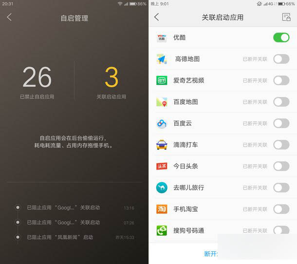 ZUK Z1的自启管理功能可智能监控与分析应用关联行为,并通过全自动及手动的方式一键切断全部不合理关联。通过系统的底层来进行加固和改造,不仅拥有了可以免Root杀掉自启应用的权限,更可以从系统底层防止这些APP的自启动。