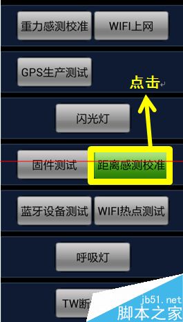 4、点进后会发现会进入如下图的界面,同样有如“重力感测校准”、“GPS生产测试”等键,选择“校准距离感测”并点击。同时将手机平放于桌面,并保证手机上方一米内无障碍物。