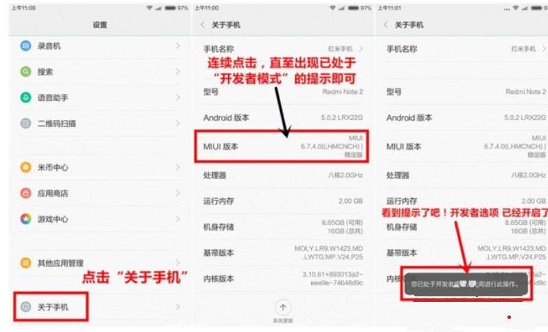拿起你的手机,打开设置 ,把菜单拉到最下面,找到“关于手机”点击,找到【中图】所示“MIUI版本”在这上面连续点击多次,【如右图】直到出现“您已进入开发者模式”即可。