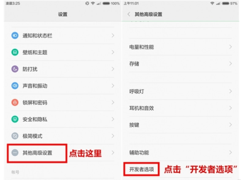 我们就要进入“开发者模式”设置里面。点击“设置”找到“其他高级设置”,找到“开发者选项”点击进入,在这里我们可以打开“USB调试”等功能