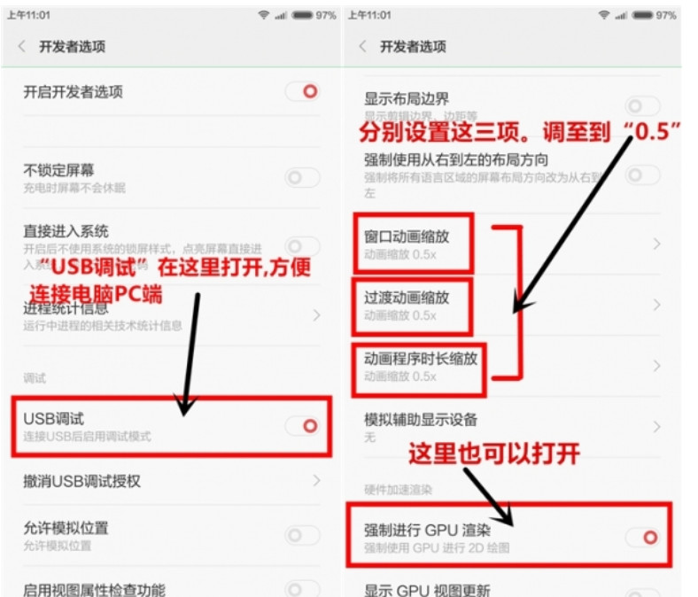 打开“USB调试”方便后连接电脑PC端,也可以什么时候使用什么时候打开。【右图】这里所示的动画时长效果,都是可以调节长短的,建议选择“0.5X”,你也可以选择【关闭】。“强制进行GPU渲染”也最好打开。