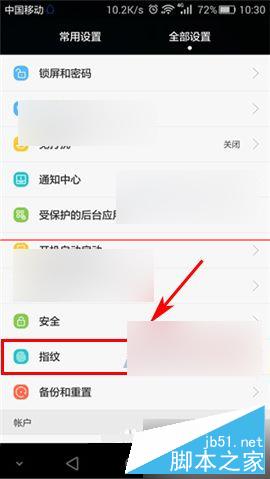 1、点击【设置】进入,在全部设置一栏,选择【指纹】 。(如下图)