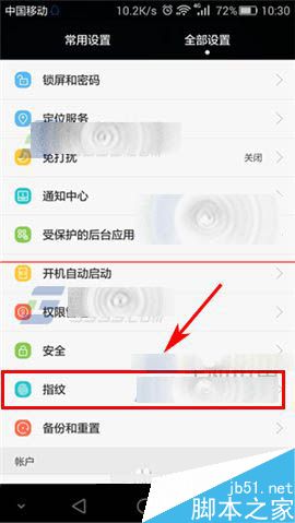 1)点击【设置】进入,在全部设置一栏点击【指纹】。(如下图)
