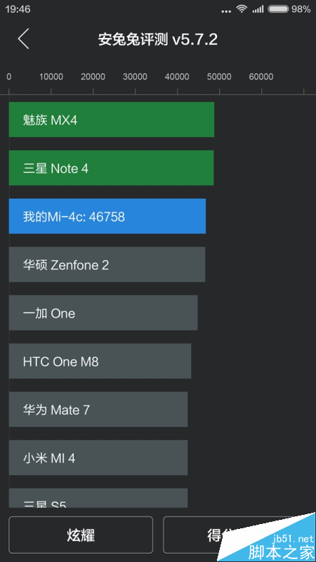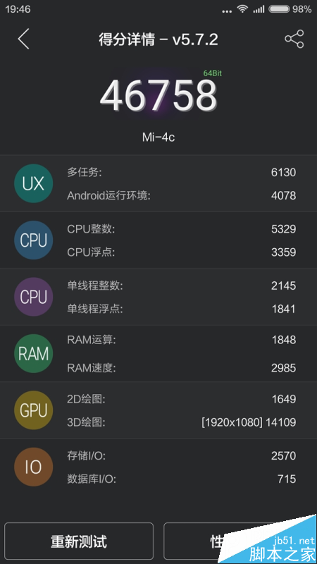 最终在满电状态下,小米4c跑出了46758分的成绩,强于骁龙801,和MT6795的成绩接近。