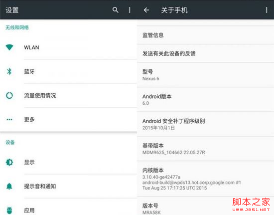 设置菜单,还是那个“味”。我们体验的是Nexus 6的官方Android 6.0系统,版本号是MRA58K,系统信息中增加了安全补丁程序的日期。