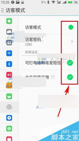2)打开后我们就把访客模式那栏右边的【椭圆】往右拉打开,然后在【允许安装应用】那里打上【√】,接着锁屏然后开屏输入【访客密码】。(如下图)