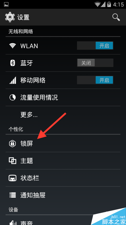 2.进入设置菜单后,可以看到如下页面,请点击个性化条目中的锁屏: