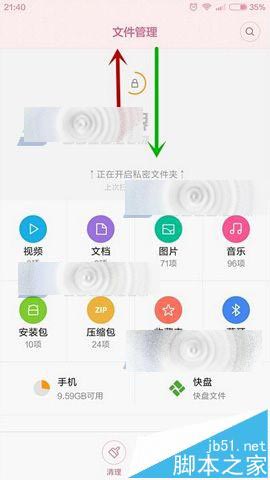 1)首先还是和之前一样,先打开手机自带的【文件管理】,打开后按住顶部往下拉进入私密模式,然后输入你之前设置的私密密码再点击【下一步】即可,如下图