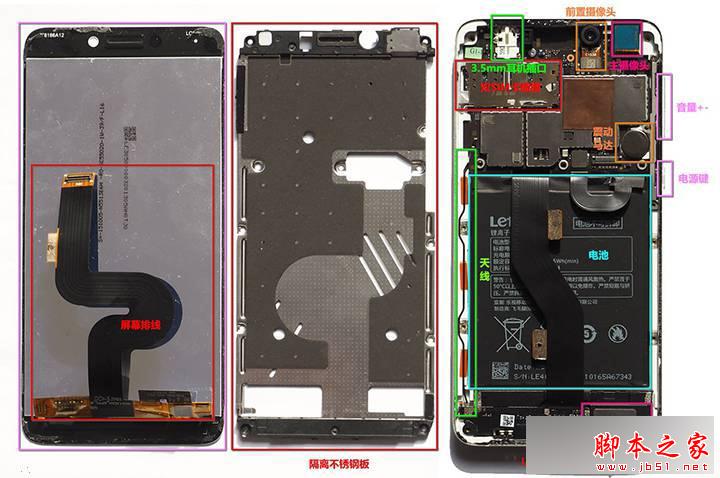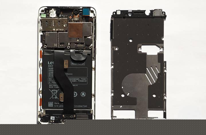 乐视官方宣称这款产品使用了“无螺钉ID”设计,意思比较容易理解,在手机外部看不到一颗螺钉。实际是如此,很多产品在机身外部都看不到螺钉,结果就是和该机一样大量使用胶水进行粘合。往往粘合部分也是拆解中最“难”处理的一部分,若是需要维修时非常容易出现把屏幕弄碎的情况。