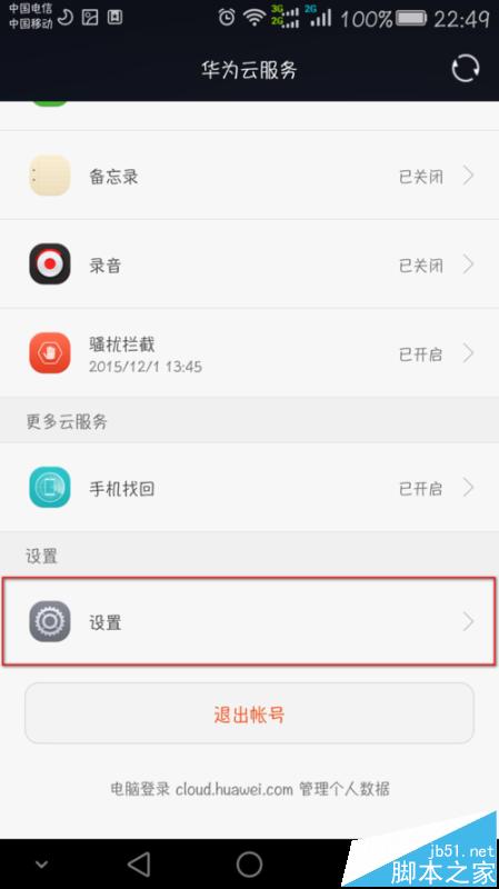 4、进入到了“华为云服务”的界面后,直接手指往上拨动屏幕,找到“设置”按钮,然后点击进入进行关键的操作;