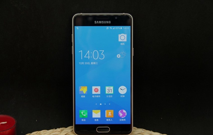 双面2.5D玻璃精致机身,三星A5 2016版真机上半部分实拍图,三星A5 2016版主打年轻用户。
